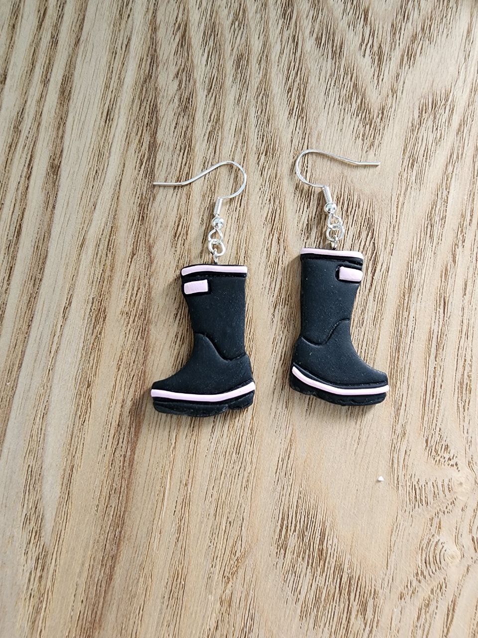 Handmade pink band gumboot earrings – New Zealand polymer clay jewelry by Jazzed Up Bling