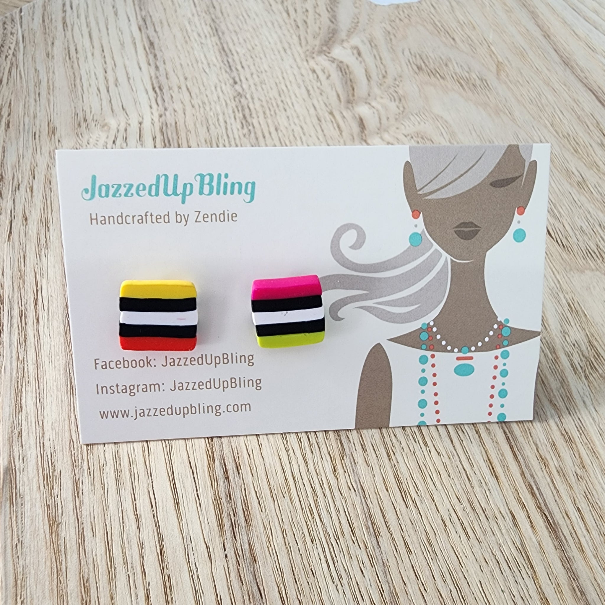 These handmade polymer clay earrings look just like the classic candy favourites — stacked in colourful layers of pink, yellow, green, black, and white.