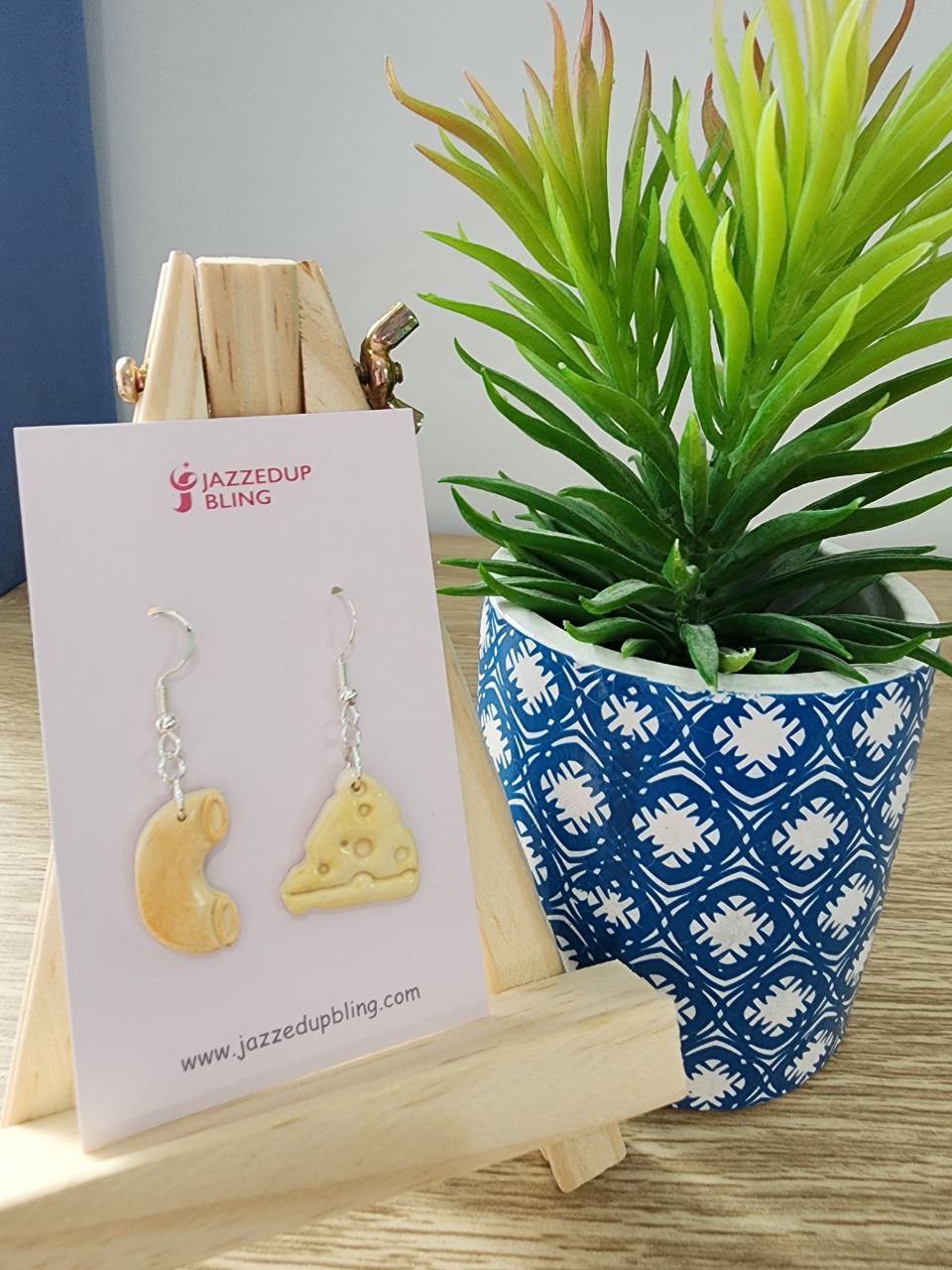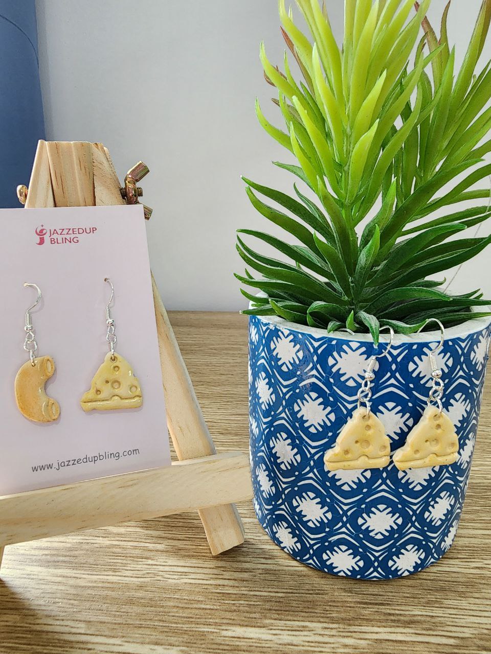 Add a fun twist to your outfit with these quirky Mac & Cheese mismatched earrings from Jazzed Up Bling! Handcrafted from lightweight polymer clay, these adorable earrings feature a cheesy wedge on one ear and a cute macaroni on the other — the perfect combo for food lovers and anyone who loves playful, one-of-a-kind accessories.