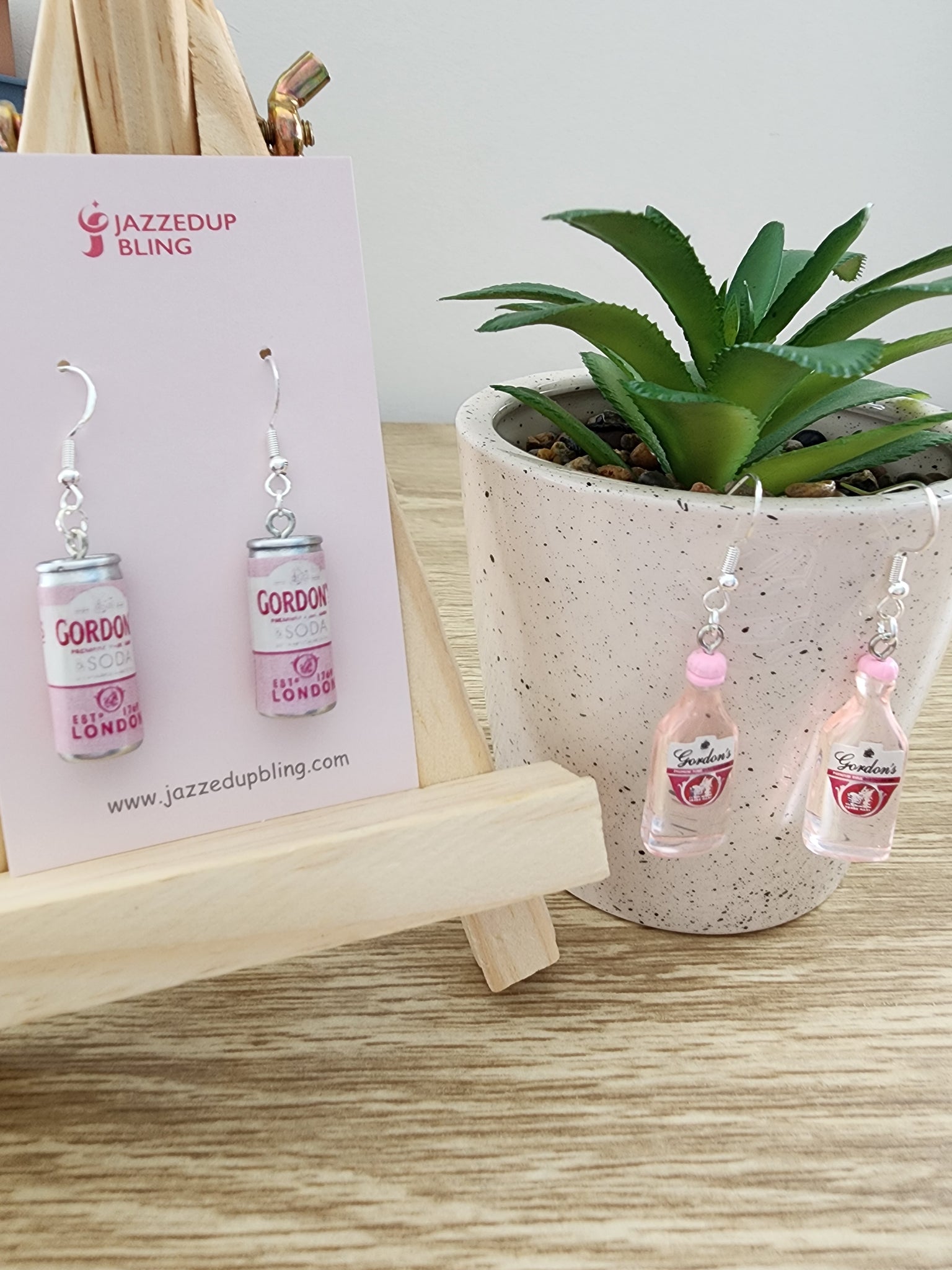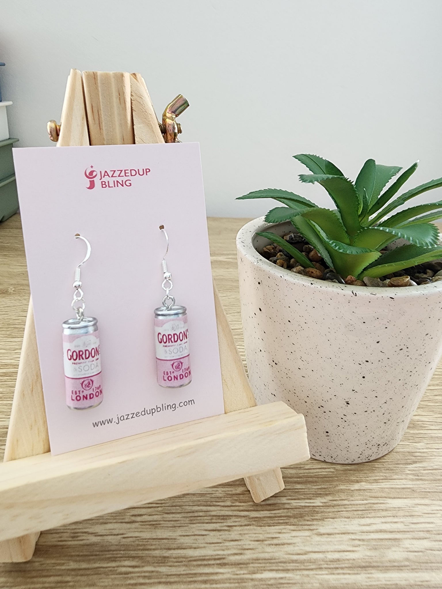 Final clearance – Pink Gin Can resin dangle earrings, lightweight and affordable.