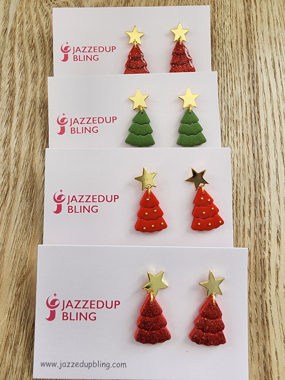 Handcrafted Christmas tree stud earrings in red and green with gold star toppers by Jazzed Up Bling displayed on earring cards