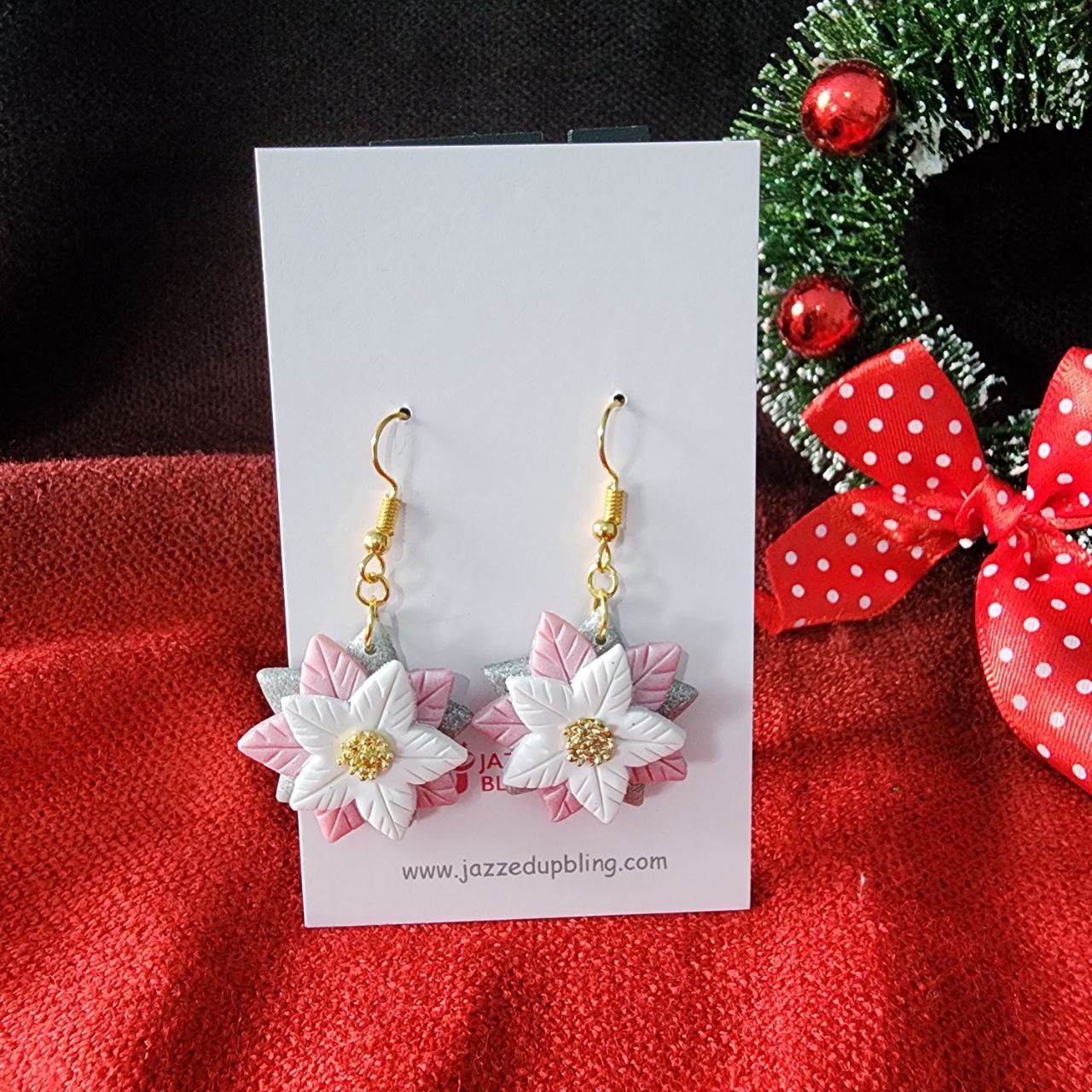 Pink and white poinsettia Christmas earrings with gold-colored copper hooks